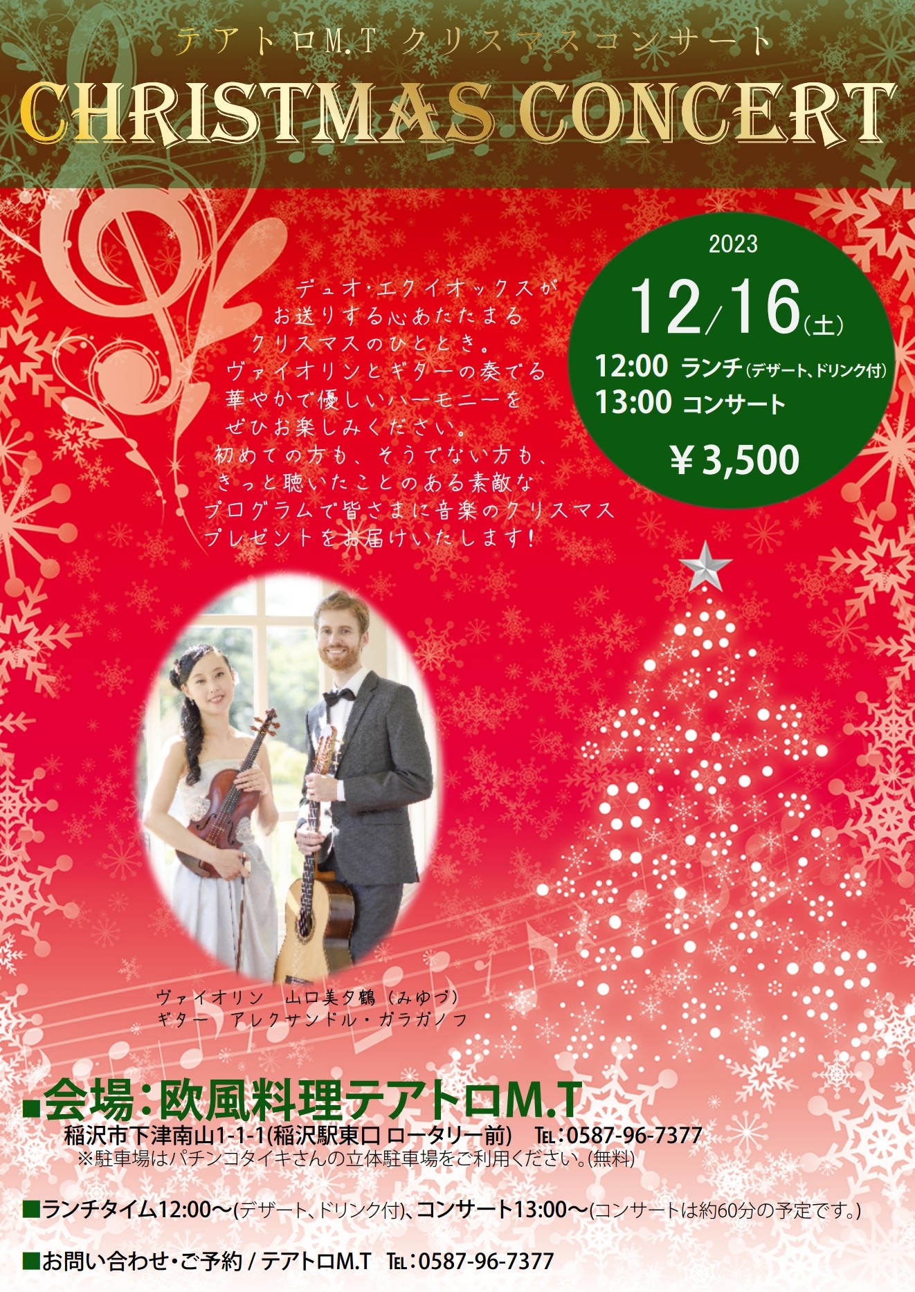 - 16(土)クリスマスコンサート、会場:欧風料理テアトロM.T稲沢市下津南山1-1-1 (稲沢駅東口ロータリー前) ※駐車場はパチンコタイキさんの立体駐車場をご利用ください。(無料)TEL:0587-96-7377■ランチタイム 12:00~(デザート、ドリンク付)、コンサート13:00~(コンサートは約60分の予定す。)■お問い合わせ・ご予約/ テアトロM.T TEL:0587-96-7377