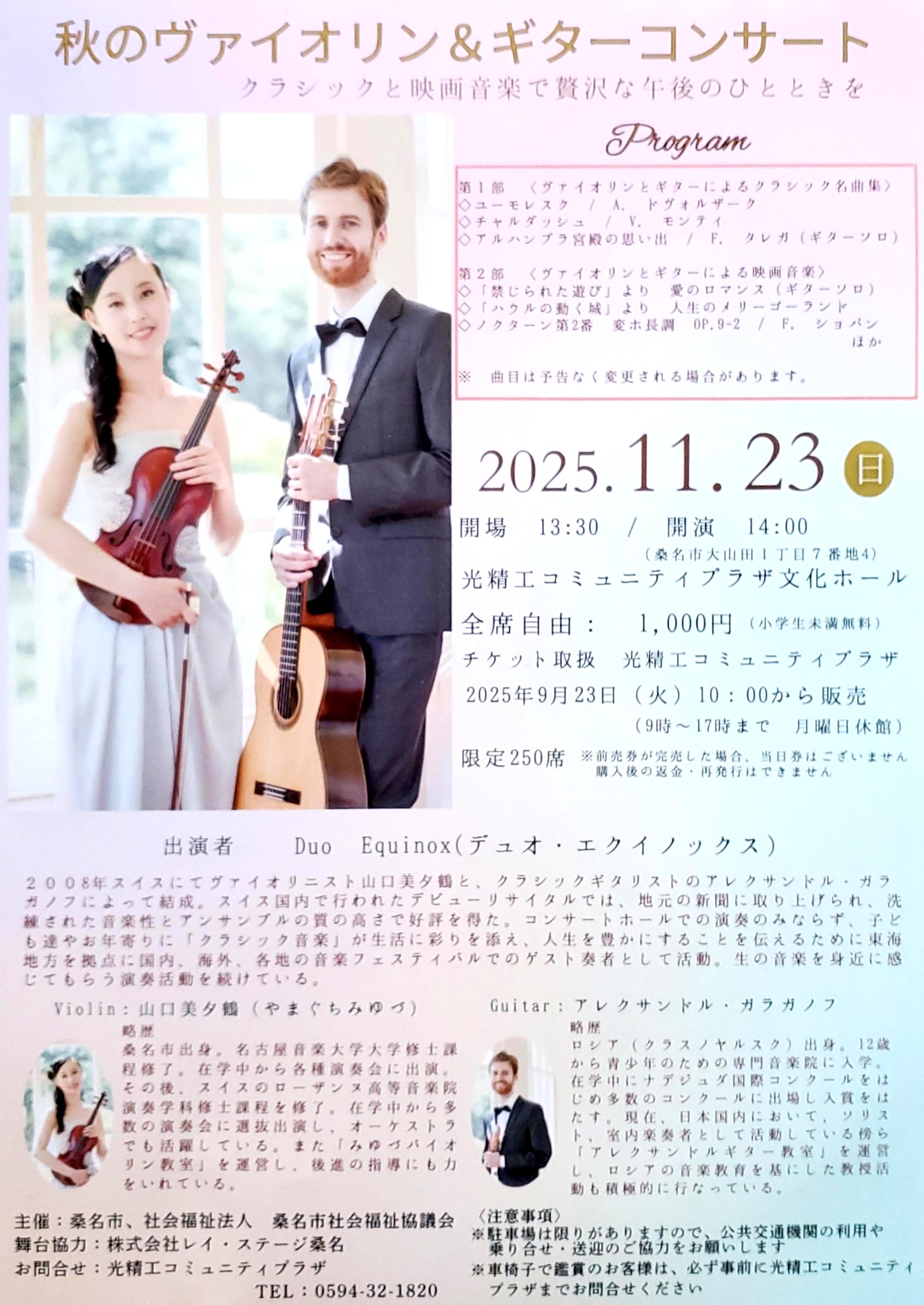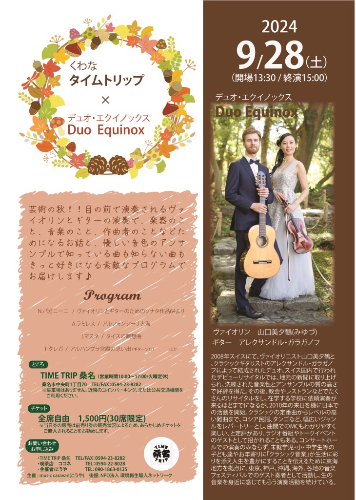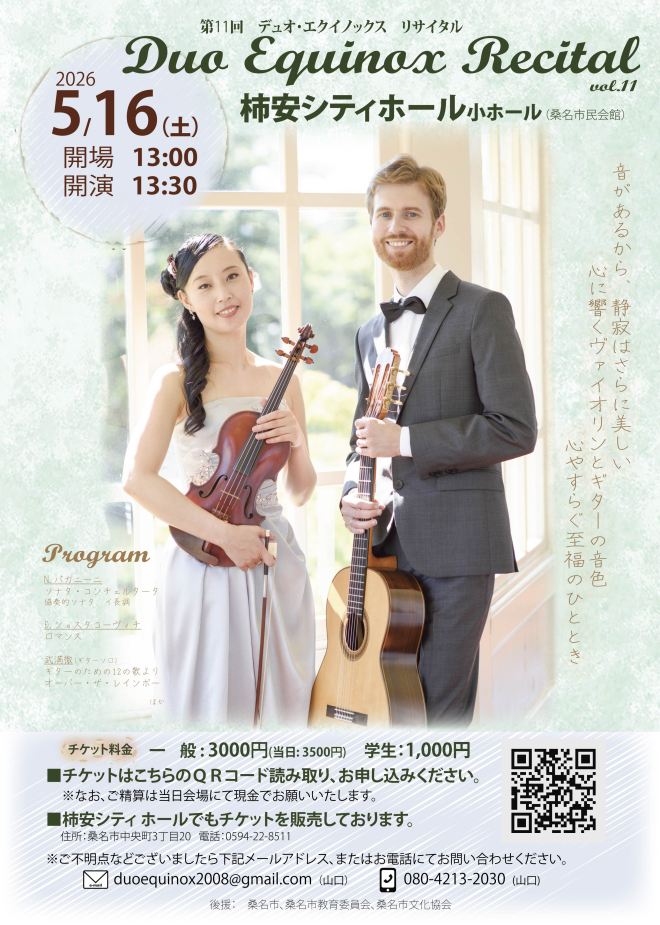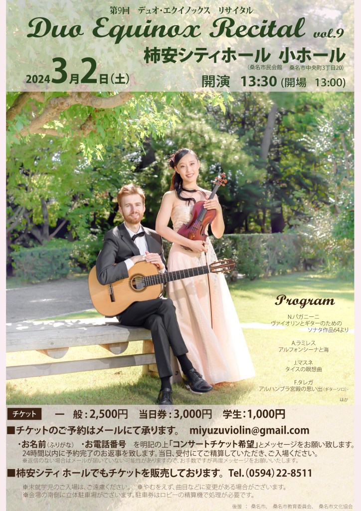 - 17日 Duo Equinox concert:NTNシティホール(桑名市民会館)小ホール, 開演 14:00 (開場 13:30), お問い合わせ : NTNシティホール桑名市中央町3丁目20 Tel. (0594)22-8511