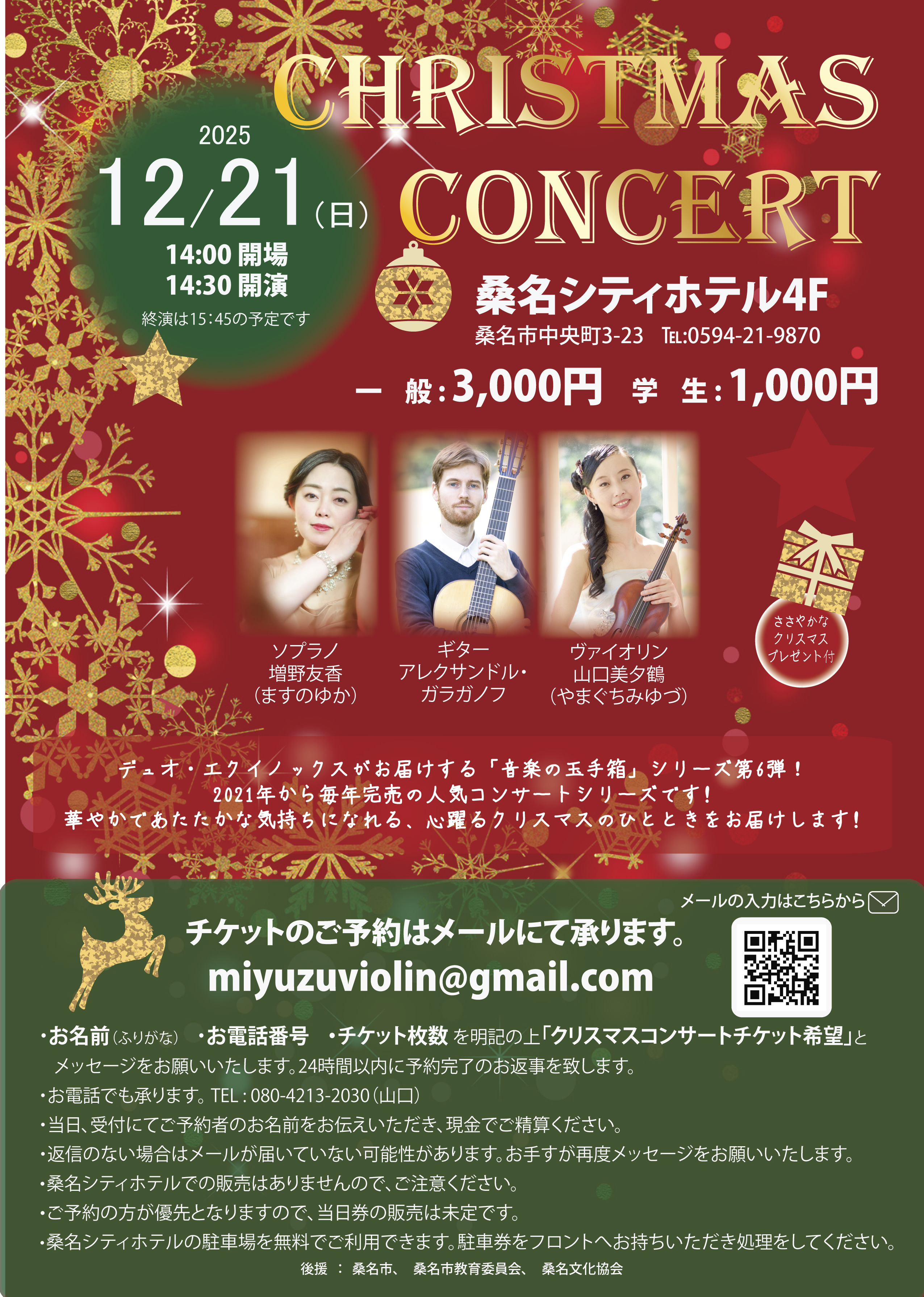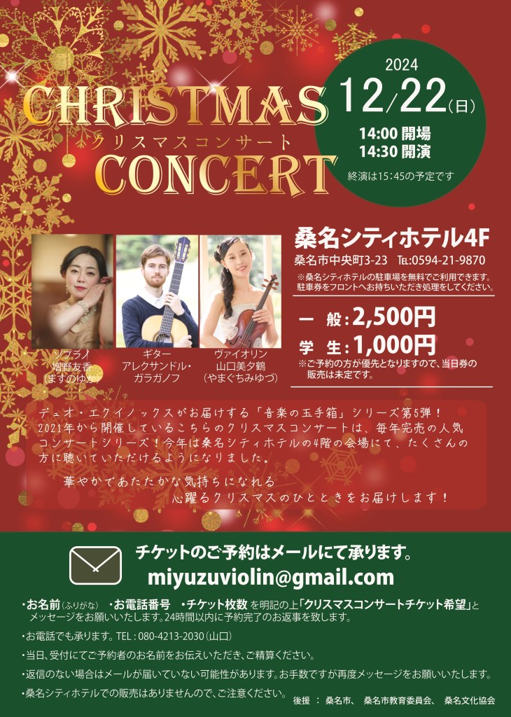 21(日)クリスマスコンサート、14:30 開演、チケットのご予約はメールにて承ります: miyuzuviolin@gmail.com 桑名シティホテル4F、桑名市中央町3-23 ℡:0594-21-9870