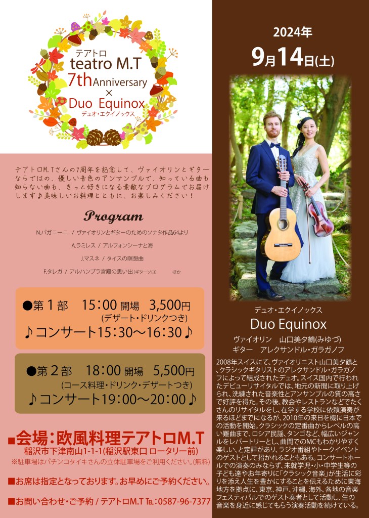 - 17, Duo Equinox concert: Reataurant Rocca(レストランロッカ)桑名市, 予約 電話:0594-27-2345