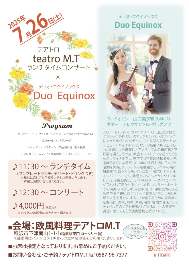 - 27, Duo Equinox concert: 桑名市民会館 小ホール, 開演 14:00 (開場 13:30), お問い合わせ : 桑名市民会館 桑名市中央町3丁目20 Tel. (0594)22-8511